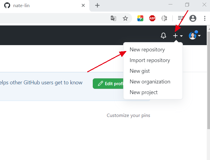 注册账号成功后登录进去,点击头像旁边的+号再点击New repository即可输入你的地址:昵称+github.io,后续输入地址即可访问(用户部署个人博客的github仓库的命名必须符合特定要求才行)