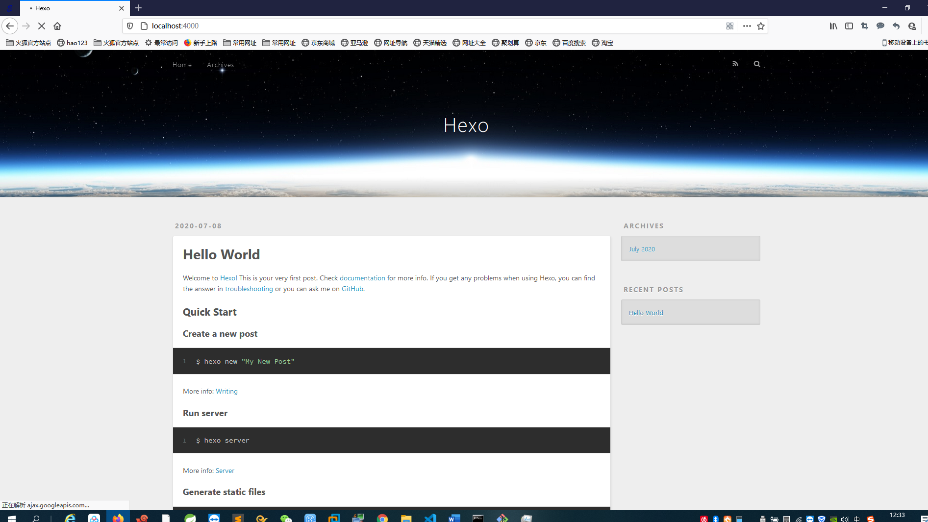 系统生成的主题我们看着不太喜欢,可以更换自己喜欢的主题,下面我以yilia-plus主题为主,也可以更换自己想更换的主题,操作都是一样的